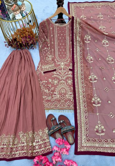 DESIRABLE FANCY FAUX GEORGETTE SEQUENCE EMBROIDERED WORK TOP AND PENT WITH DUPATTA