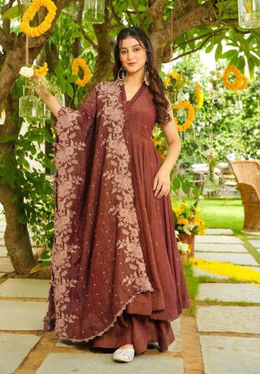 New Designer Party Natural Crap with Embroidery Sequence Top Pallazo & Dupatta Set