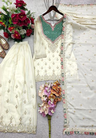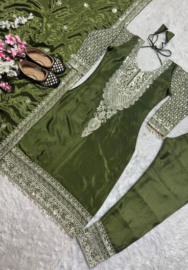 New Designer Pure Chinnon With Heavy Embroidery Sequence Work Top-Bottom And Dupatta Set
