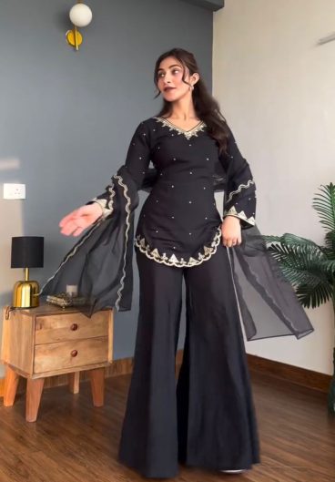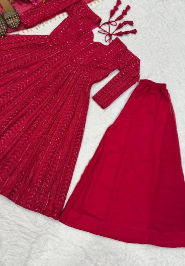 New Designer Palzoo Set Elegant Ethnic Wear Premium Fabric In Top-Plazzo And Dupatta Set Fully Stitched