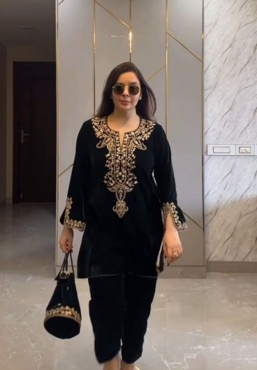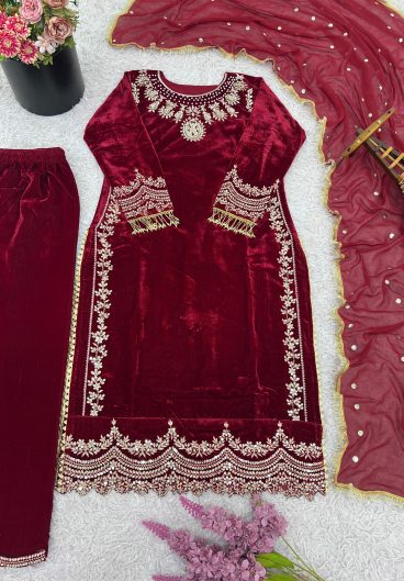 Pure Viscose Velvet With Embroidery 5mm Sequences Work With Sleeves Salwar Kameez