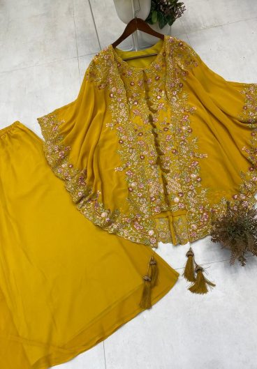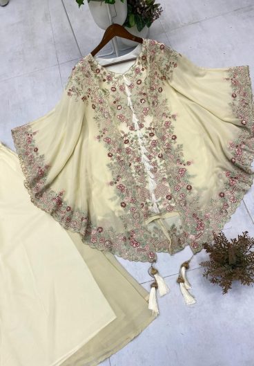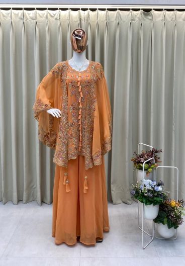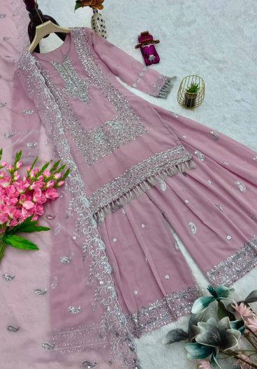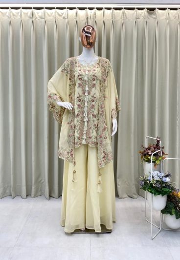 DESIGNER WEAR KURTA PLAZZO PAIR WITH SHRUGE IN SEQUENCE EMBROIDERY WORK