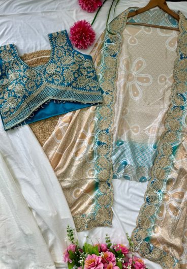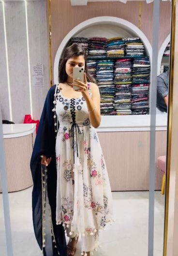 Heavy 1000 Butti Georgette With Digital Print And Mirror Work With Pom Pom Lace Border Salwar Kameez