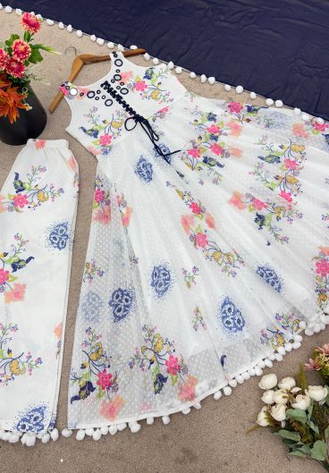 DESIGNER WEAR PRINTED TOP WITH PANT PAIR IN REAL MIRROR WORK