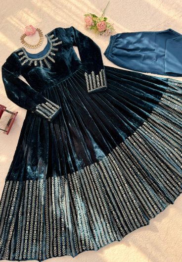 WINTER SEASON VELVET DESIGNER WEAR KURTI PLAZZO PAIR WITH EMBROIDERY WORK
