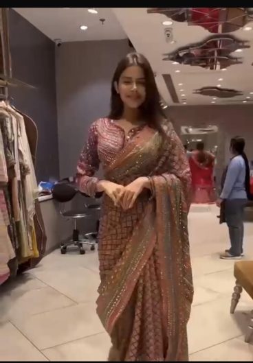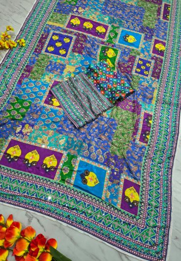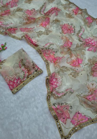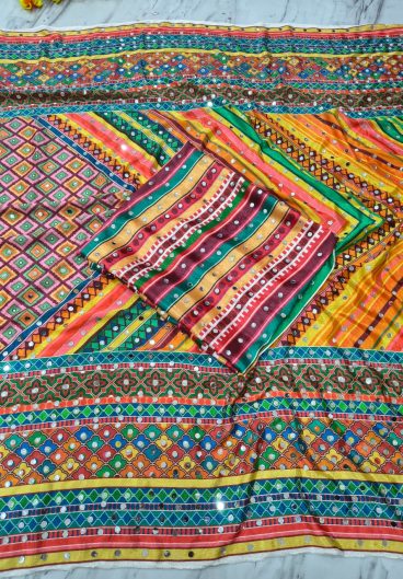 Premium Chinon Silk With Beautiful Print And With Beautiful Real Mirror Work Saree