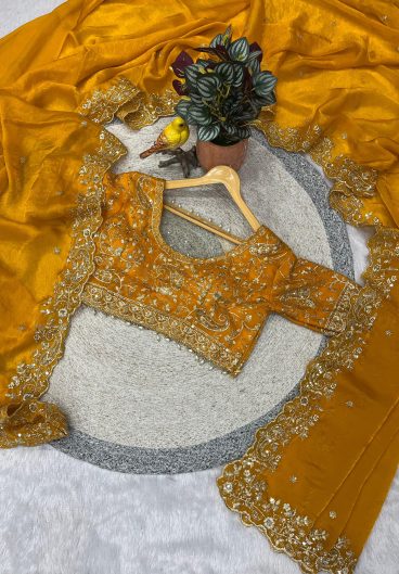 Faux Georgette with Intricate Thread & Sequence With Moti Work Yellow Saree