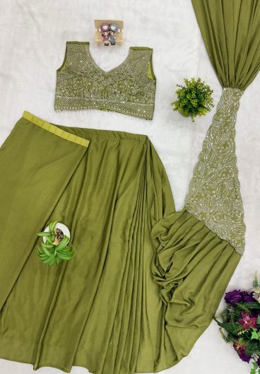 DESIGNER WEAR LAHENGA SAREE WITH LONG BLOUSE AND HEAVY EMBROIDERY WORK