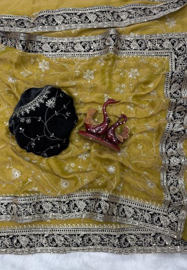 Moss silk with Beautiful Sequence and Zari work Embroidery with velvet lace border Saree