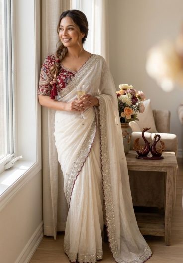Soft Twill with Beautiful Sequence and zari Embroidery work with Fancy lace border Saree