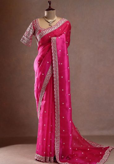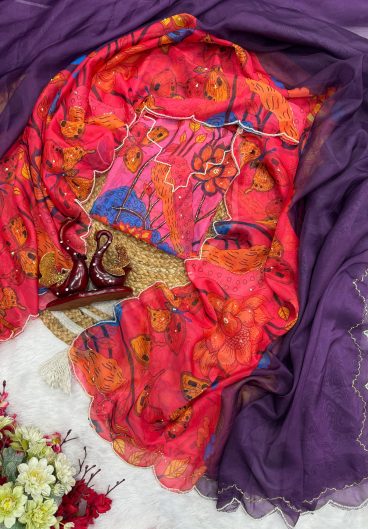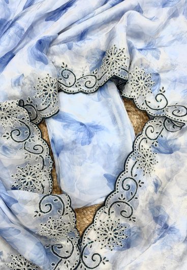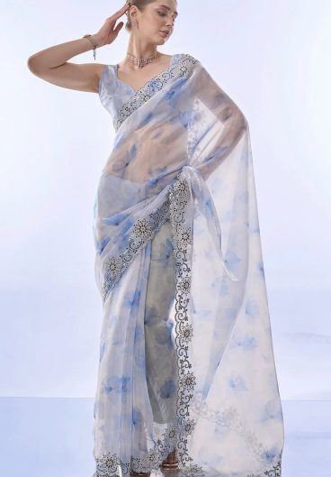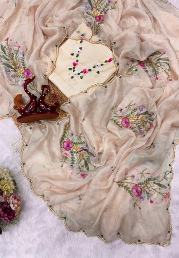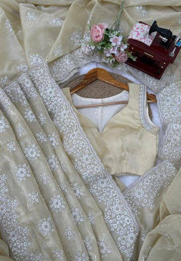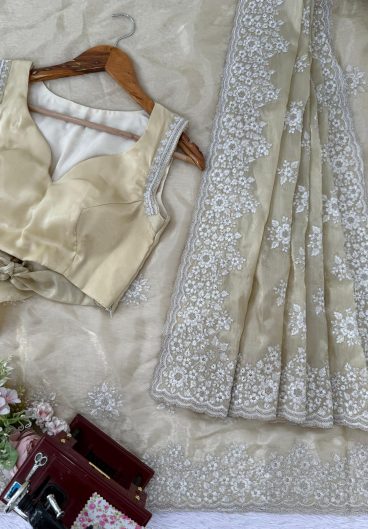 Thai Organza Silk WITH Beautiful Designer Thread Embroidery Work with Cutwork Border Saree