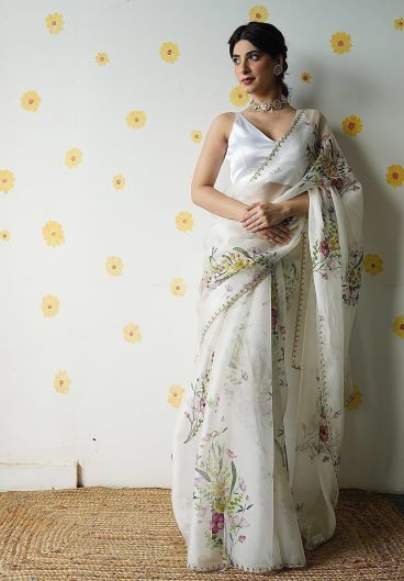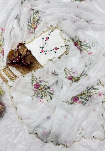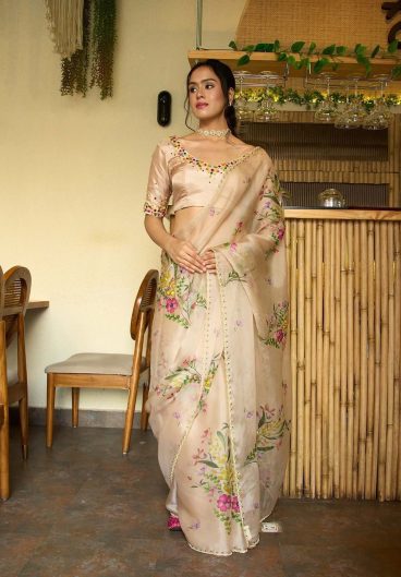 Soft Tebby Silk with Beautiful floral print with beads Sequins and katdana handwork in border Saree