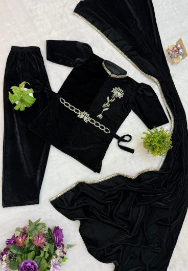 NEW SUPERHIT TRENDING 3 PCS INDO-WESTERN SAREE EMBROIDERED STYLIST TOP BOTTOM & PALLU ON 9000 VELVET FABRIC