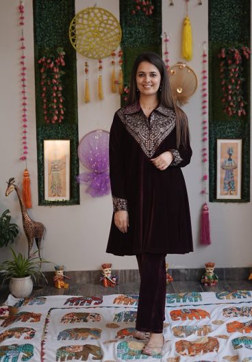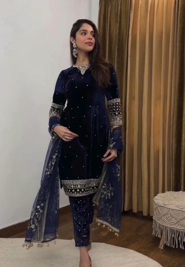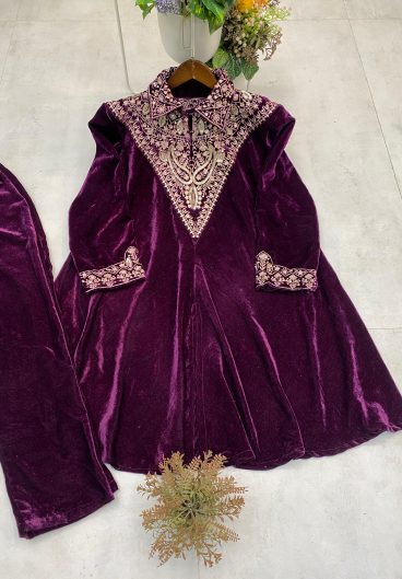 WINTER SEASON VELVET DESIGNER WEAR KURTA PANT PAIR WITH EMBROIDERY WORK