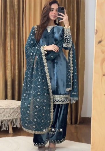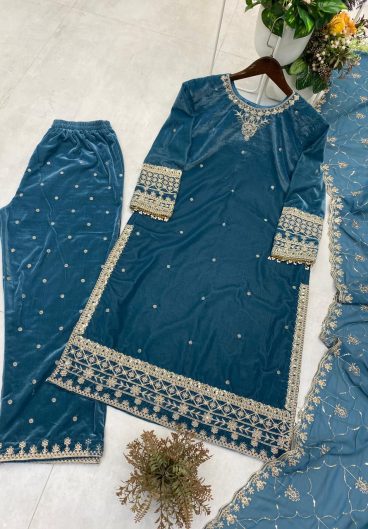 VELVET DESIGNER WEAR KURTA PLAZZO WITH SEQUENCE EMBROIDERY WORK
