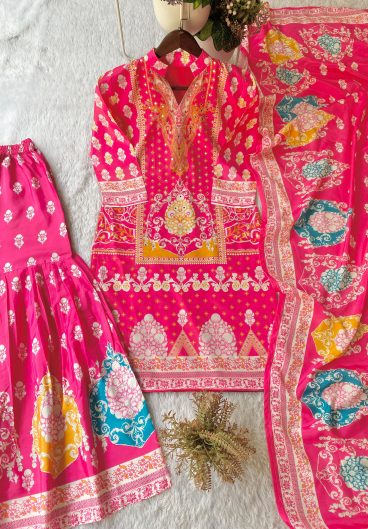 WEDDING SEASON 3 PIECE PRINTED KURTI PLAZZO AND DUPATTA WITH REAL MIRROR WORK