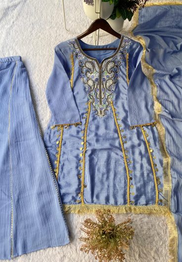 PARTY AND WEDDING SEASON 3 PIECE KURTI PLAZZO AND DUPATTA WITH SEQUENCE EMBROIDERY WORK