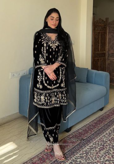 VELVET DESIGNER WEAR KURTA SALWAR PAIR WITH SEQUENCE EMBROIDERY WORK