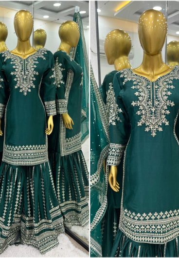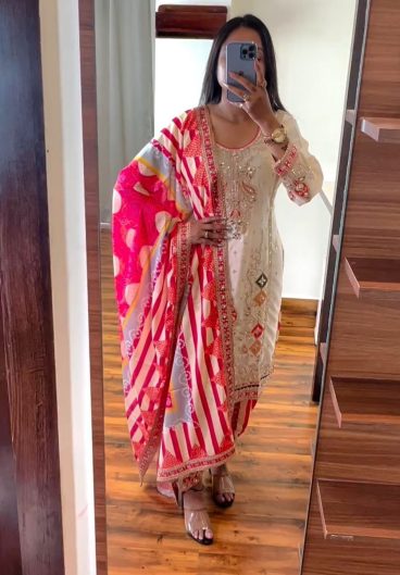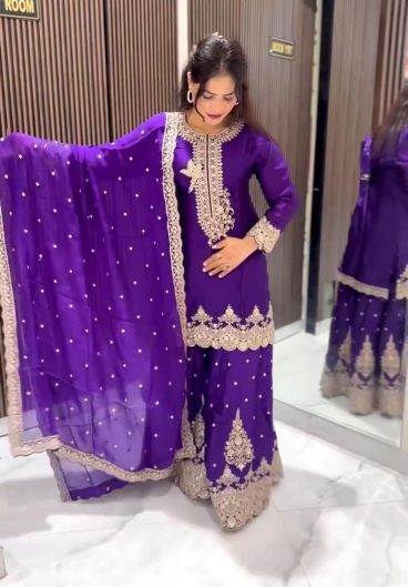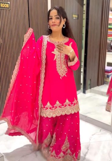 New Designer Pure Chinnon With Heavy Embroidery Sequence Work Top-Bottom And Dupatta Set