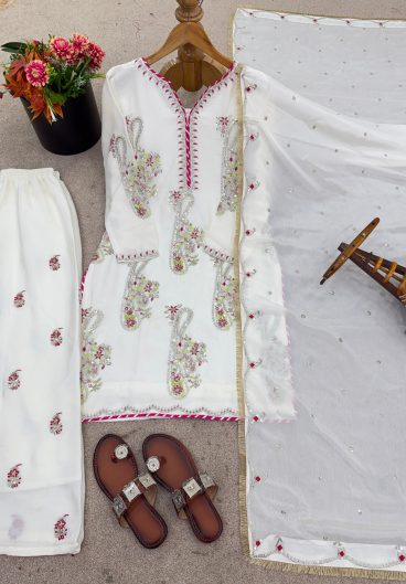 New Designer White Pure Faux Georgette Top-Bottom And Dupatta Set