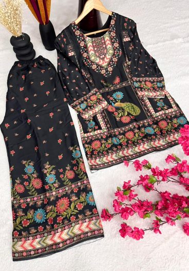 New Multi Coloured Embroidered Attractive Party Wear Chinon Silk fabric Kurti Plazzo pair