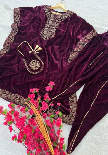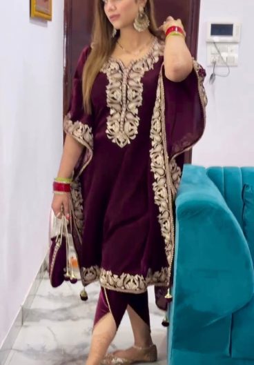 Winter Wear Wine Embroidered Attractive Party Wear Viscose Velvet fabric Kaftan dhoti