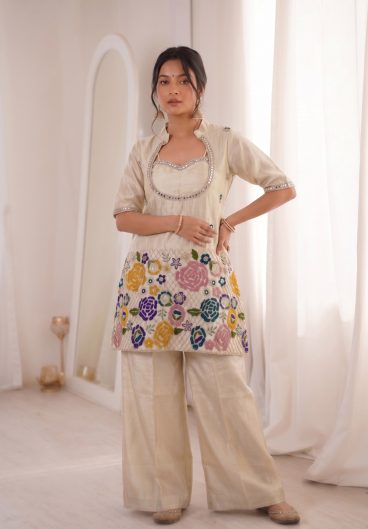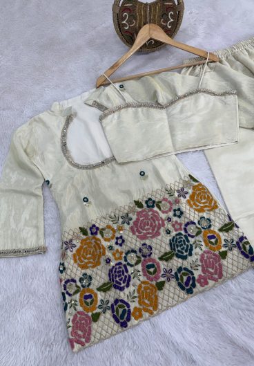 Premium Tissue Shimmer Silk Top with Heavy 3mm Sequence Coadding Embroidery Work With Real Mirror Work Co-Ord Shimmer Set