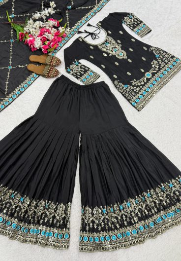 New Designer Party Wear Look Heavy chinon silk Material With 5mm Sequence Embroidery Work Top Sharara Plazzo & Dupatta