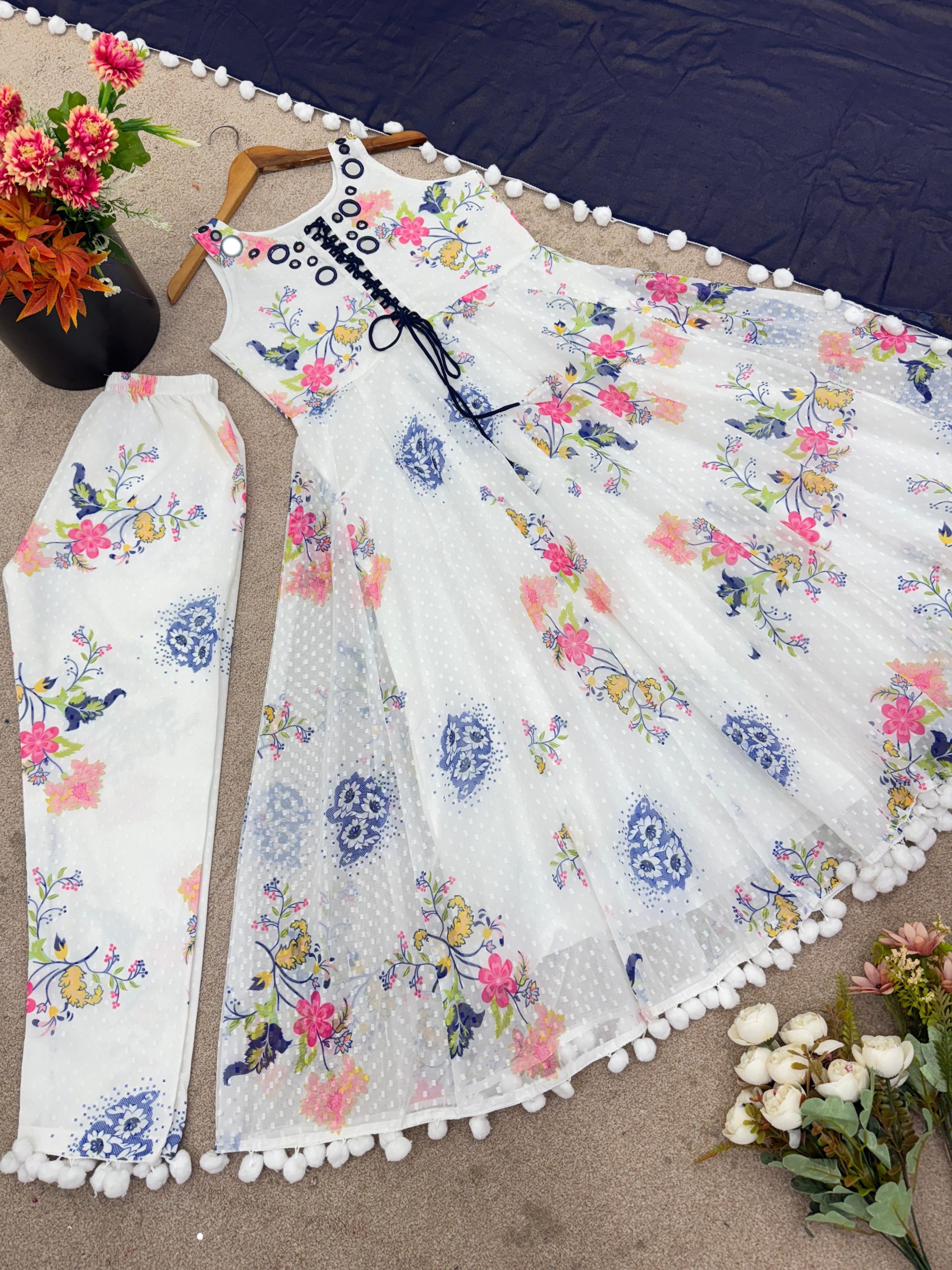 • *Fabric:* *Heavy 1000 Butti Georgette With Digital Print And Mirror Work With Pom Pom Lace Border With Fully Flair*
