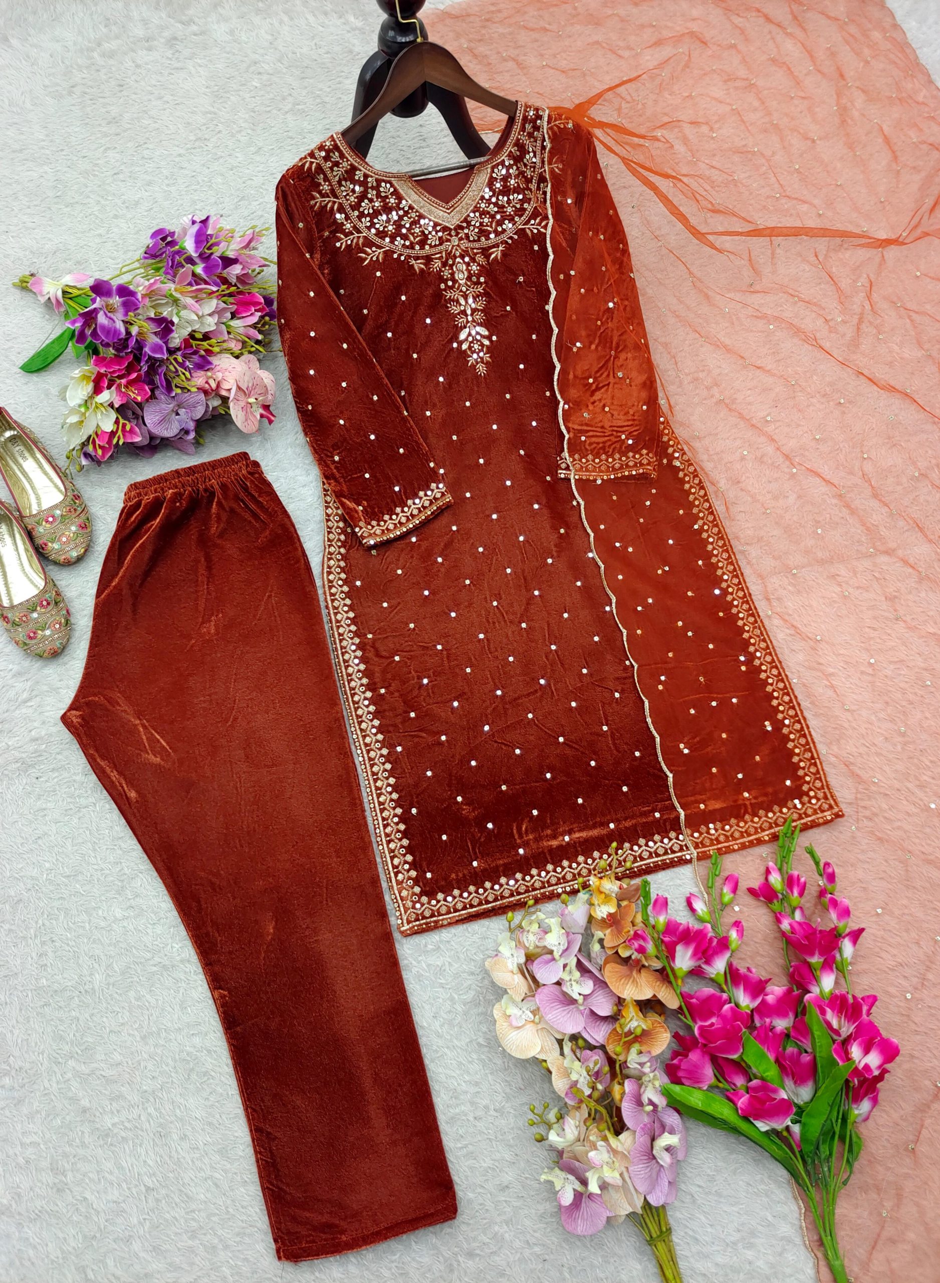 *Top Fabric*: Pure *Viscose Velvet* With Embroidery 5mm Sequences Work With Sleeves