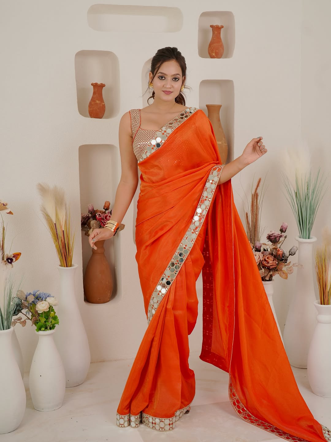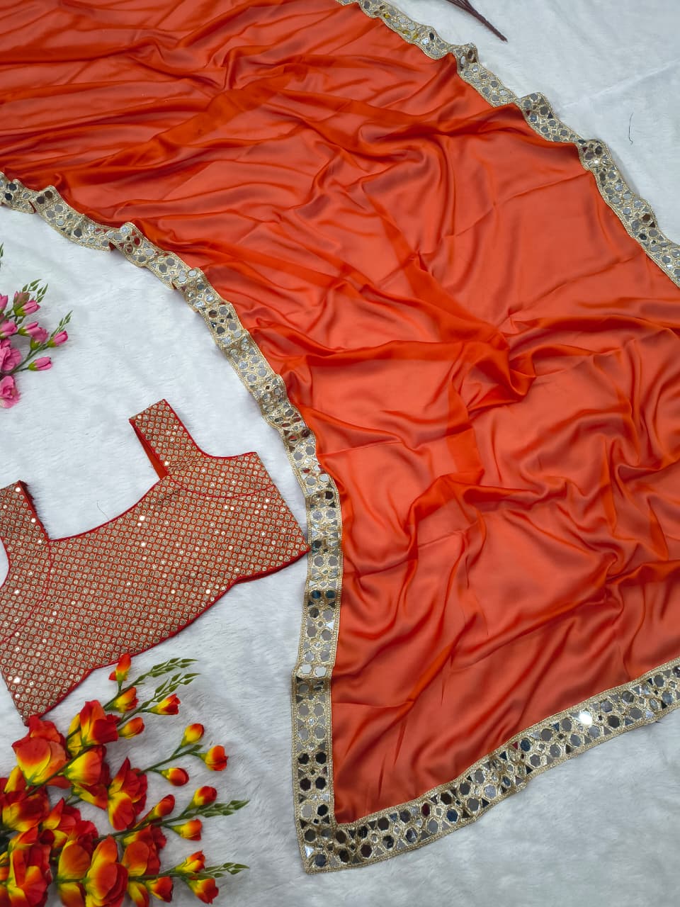 Be the first to review “Premium Rangoli Silk Embellished With Beautiful Heavy Real Mirror Work Lace Border Work Saree”