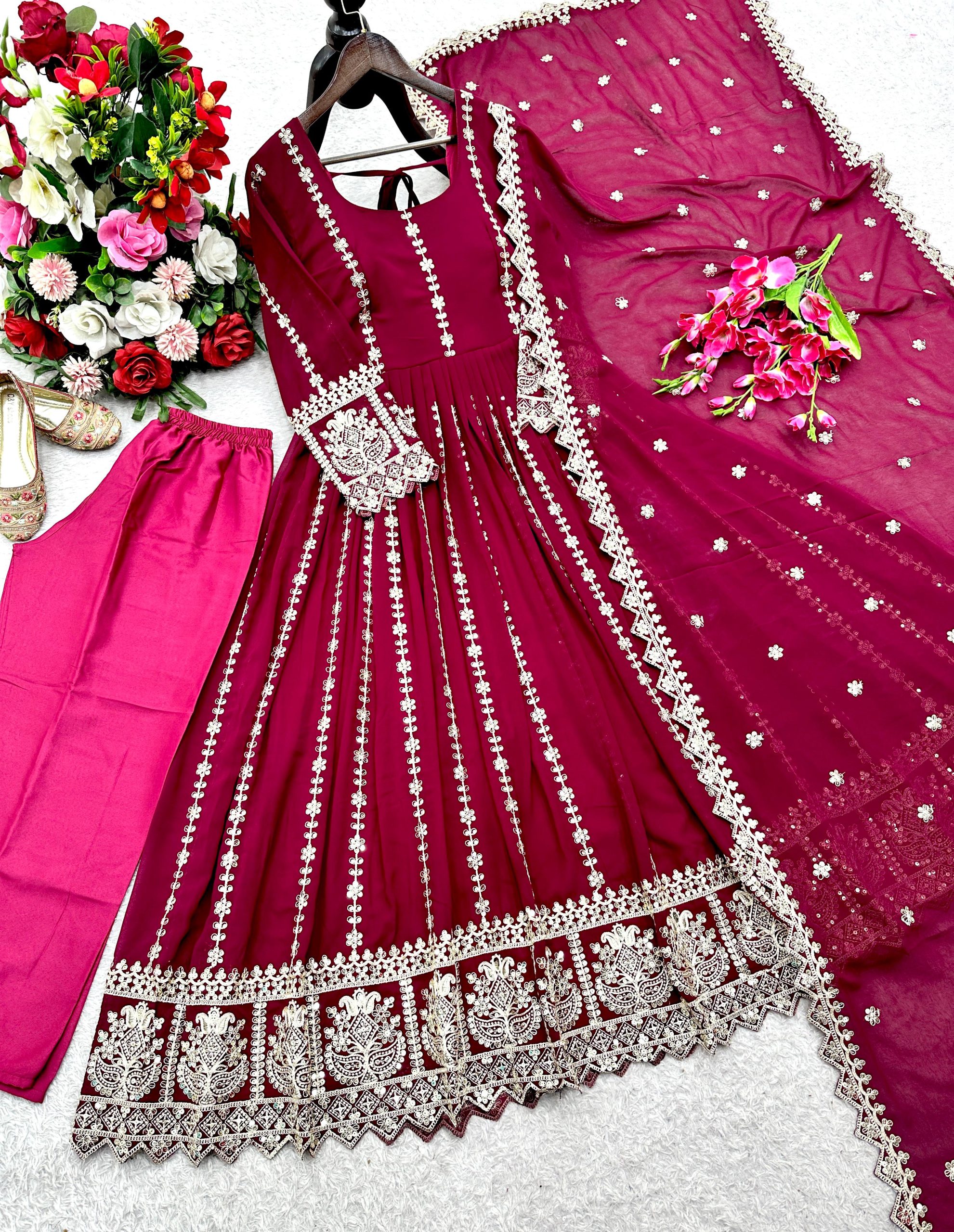 *Gwon Fabric*: Pure *Blooming Georgette* With Emrodery 5mm Siqwans&Coding Dori Work With Sleeves With(*Ped With Fency Latkan Dori*)