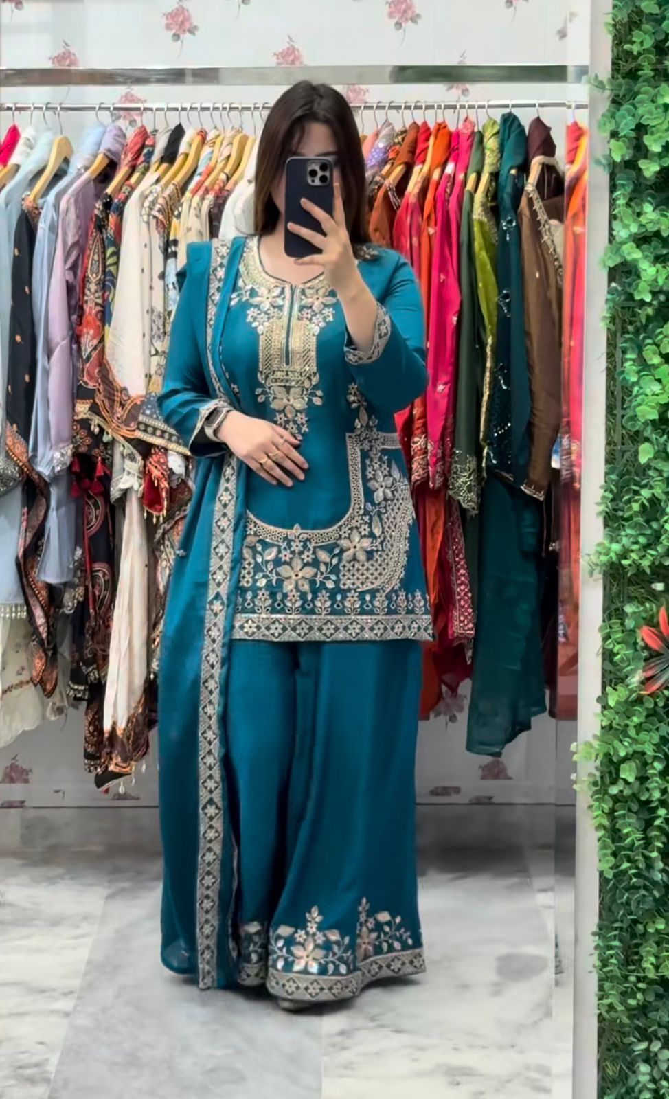 *Plazzo Fabrics* :Pure Heavy Natural Crep Silk Heavy Embroidery Work With Moti Work Fancy Borders Less Work Fully Flair.