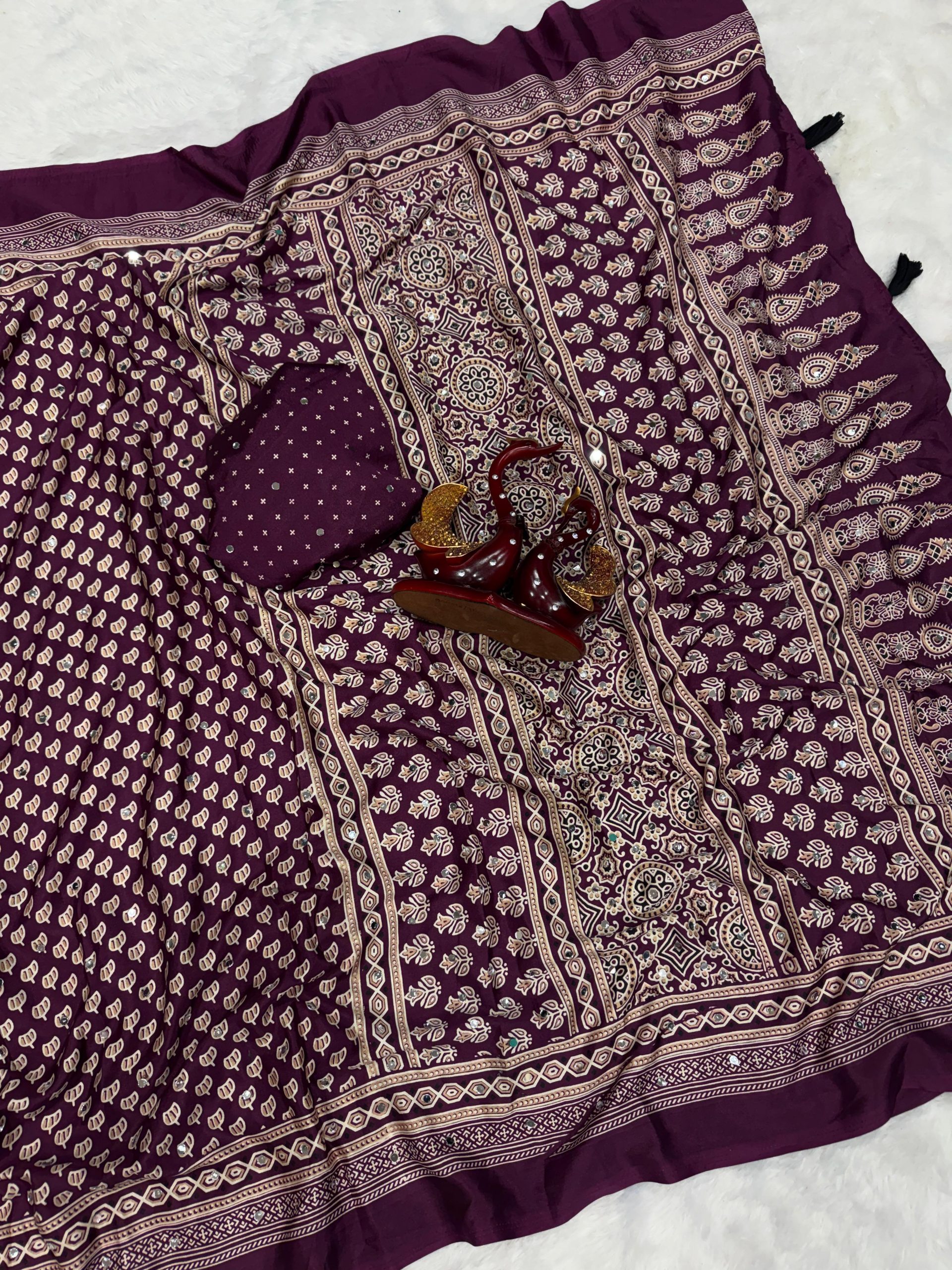 *SAREE FAB. :* Soft crepe silk WORK :* Beautiful Ajarakh print with Real mirror work and beautiful tussle * BLOUSE* Running Saree Fabric