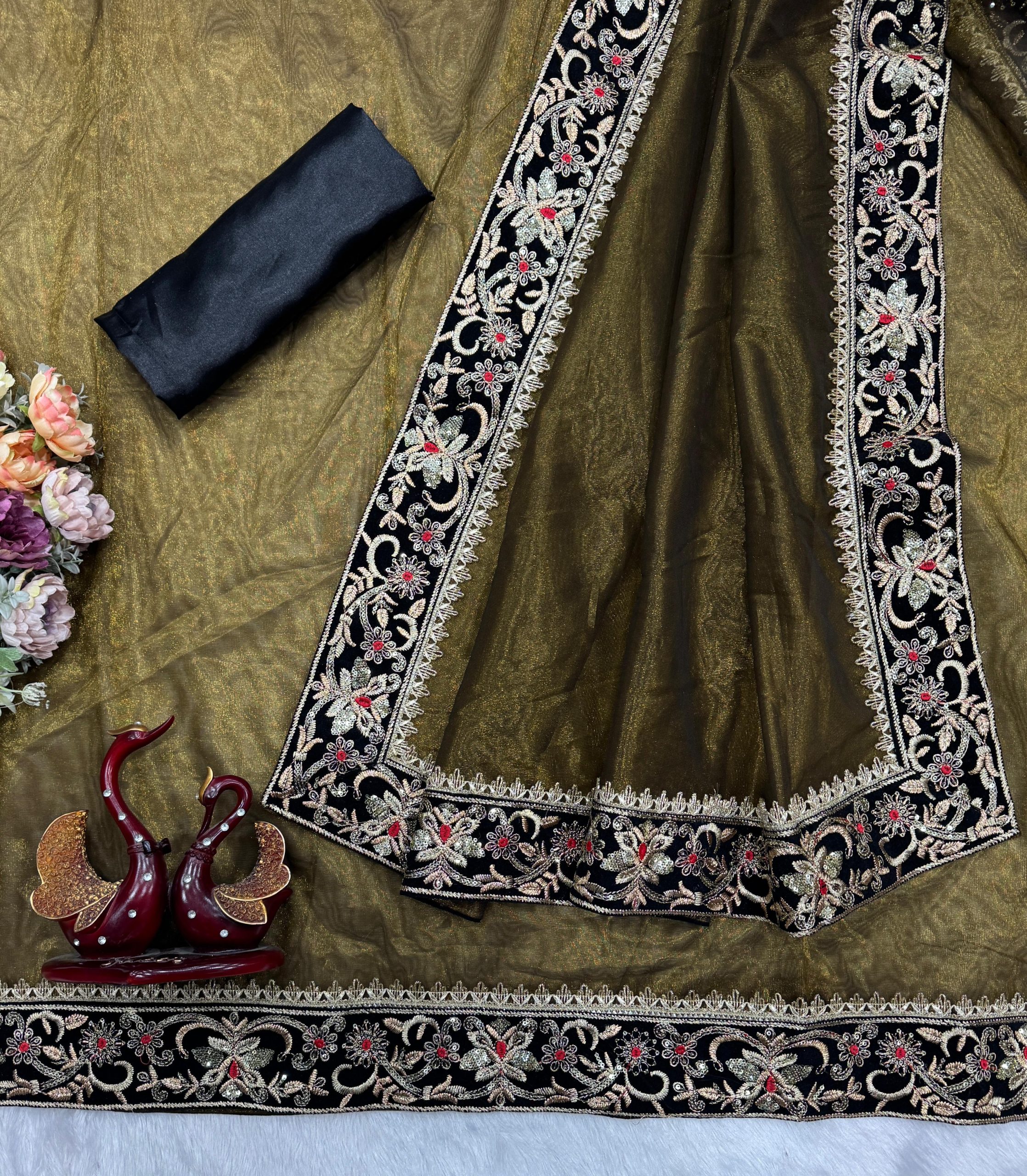 *SAREE FAB. :* Soft Twill WORK :* Beautiful Sequance and zari Embroidery work with Fancy lace border * BLOUSE*- Satin Silk