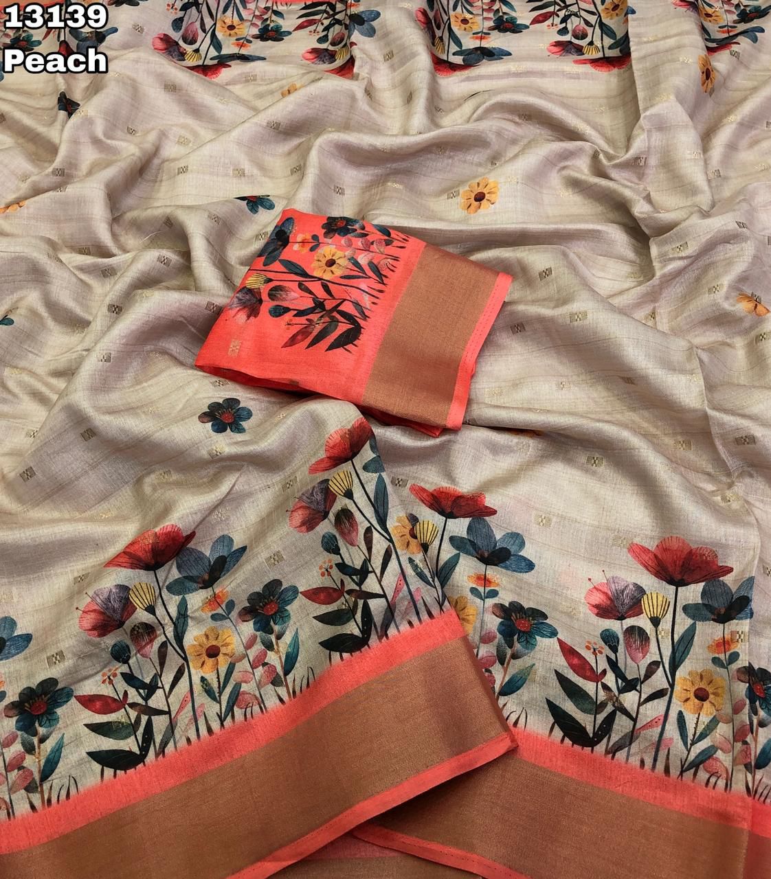 Fabric – Tussar silk floral digital print with gold zari butti weaving & zari border Blouse – printed blouse