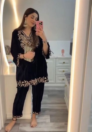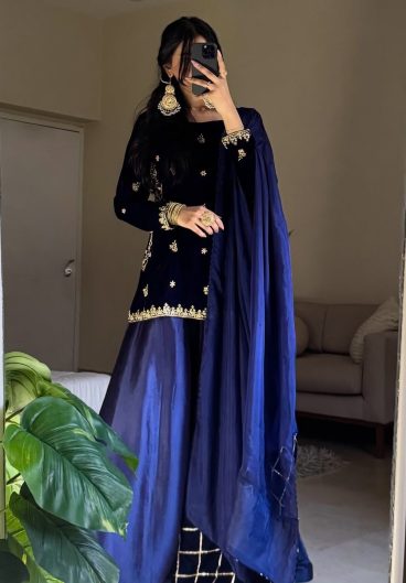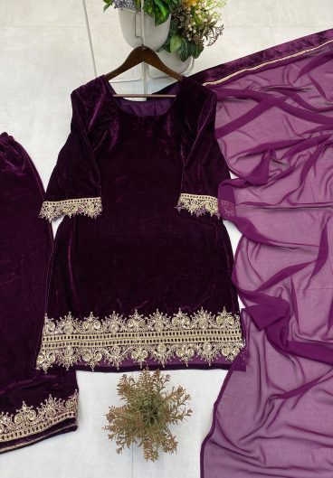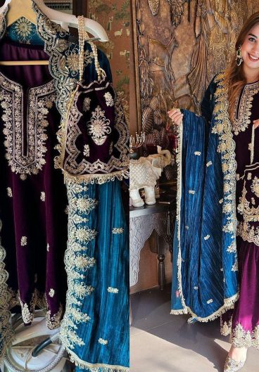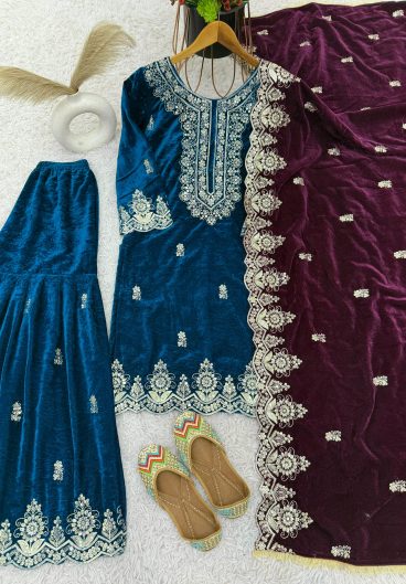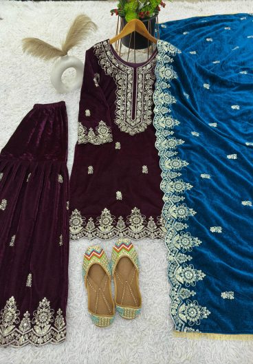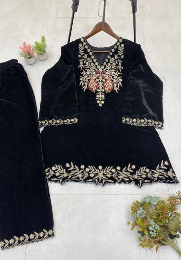 WINTER SEASON VELVET DESIGNER WEAR KURTA PLAZZO PAIR WITH EMBROIDERY WORK