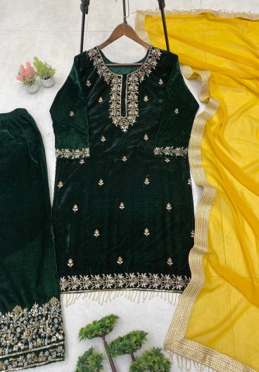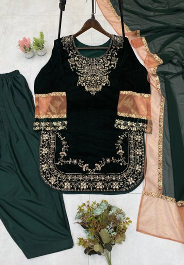 EXCLUSIVE 3 PIECE VELVET KURTA PLAZZO PAIR WITH SEQUENCE EMBROIDERY WORK