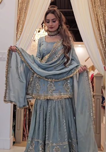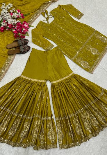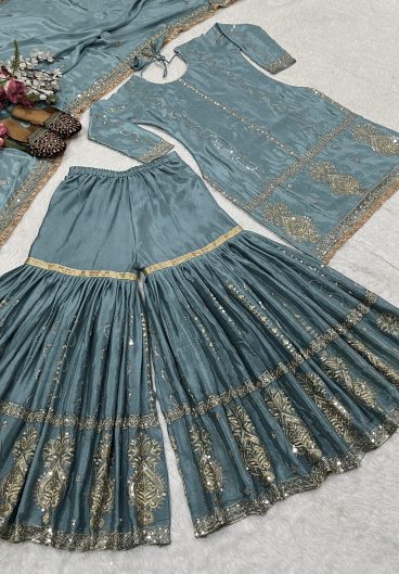 Heavy Chinnon Silk With Heavy Embroidery Sequence Work Designer Party Wear Look Top Sharara and Dupatta