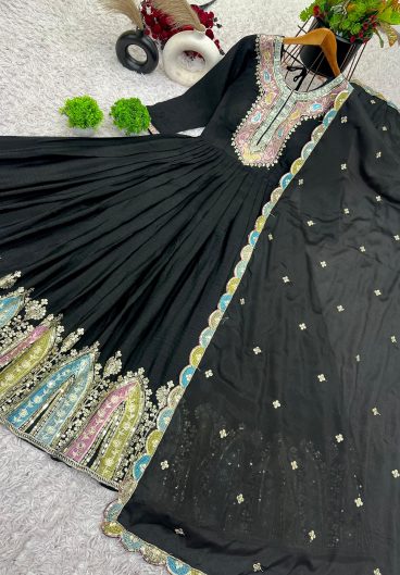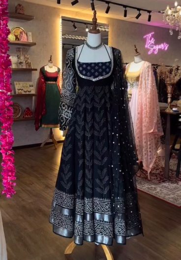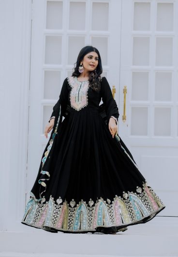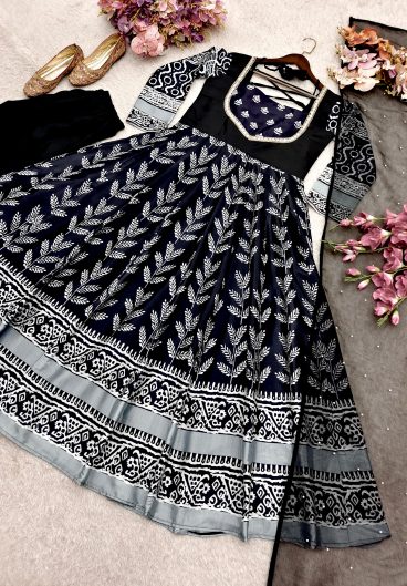 New Chinon Silk Print Beautiful Black Gown Pent & dupatta Ready To Wear Set