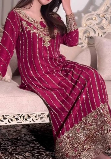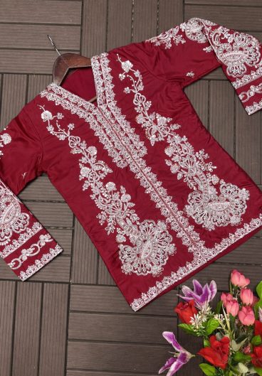 Pure berry silk with machine embroidery & hand embellishments on neckline and sleeves Salwar Kameez