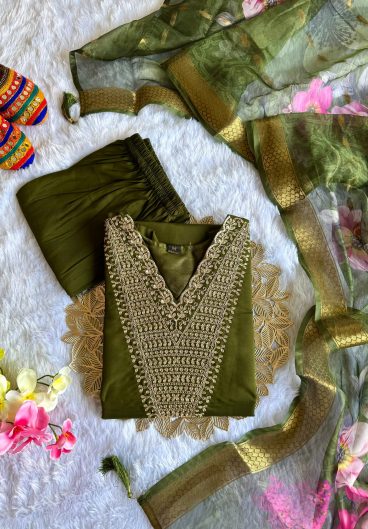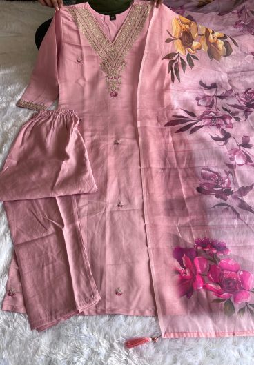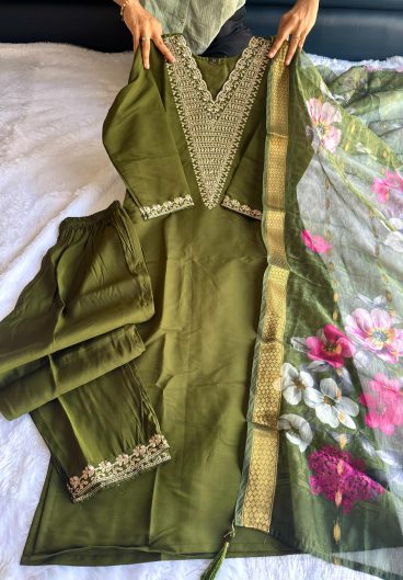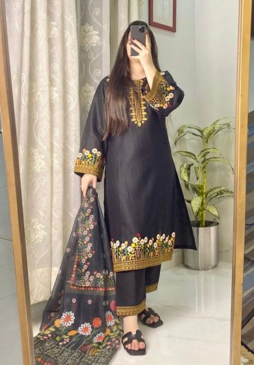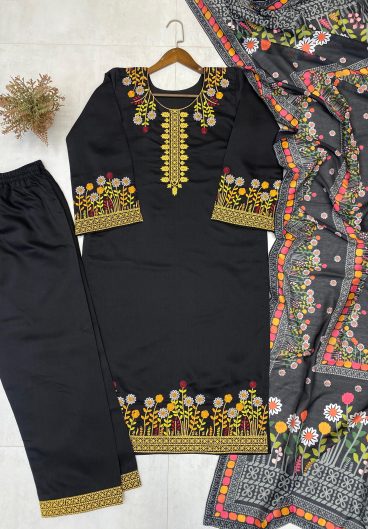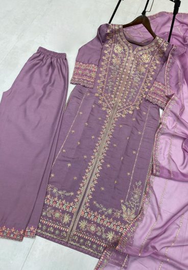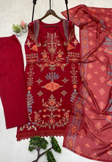DESIGNER WEAR ROMAN SILK WITH EMBROIDERED TOP WITH PANT & DUPPATA PAIR
