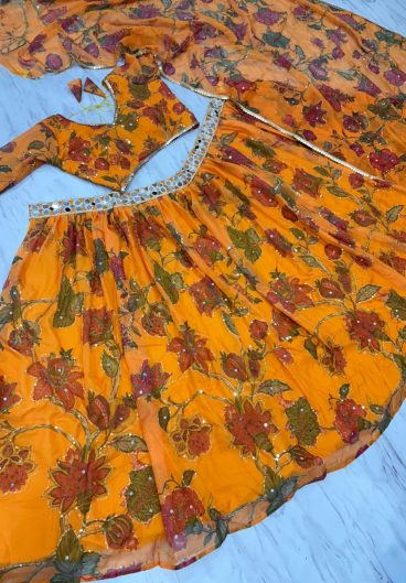 Premium Taby Silk Embellished With Beautiful Print With Beautiful Hand Mirror Work Lehenga Choli