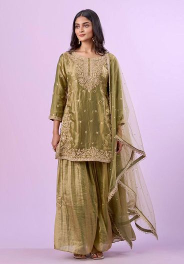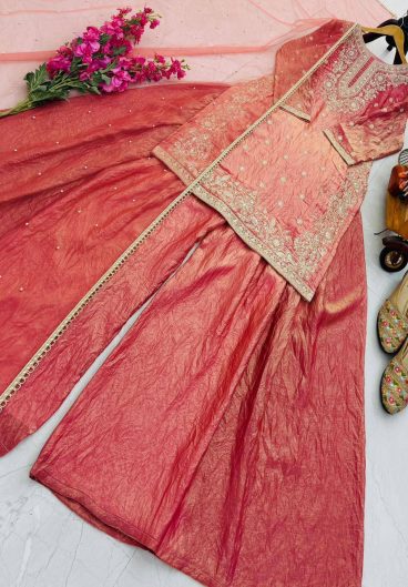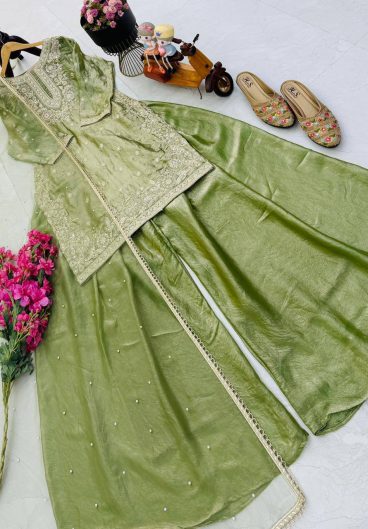 New Designer Fandy Silk Party Top Pallazo & Dupatta Set