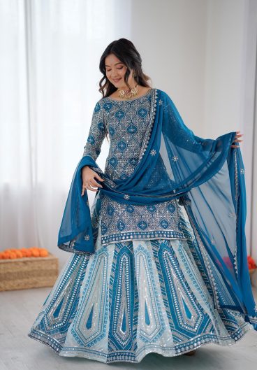 Faux Georgette Thred With Sequnce Work Semi-Stitched Top Lehenga Dupatta set