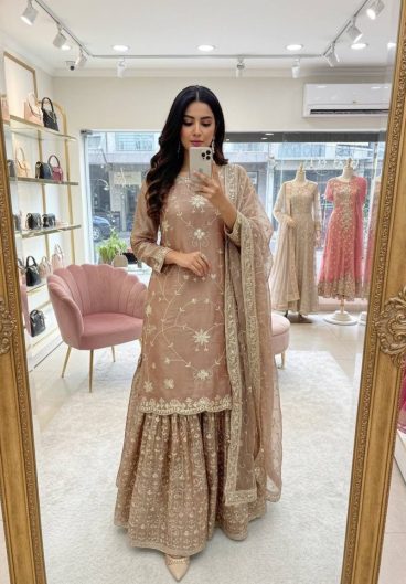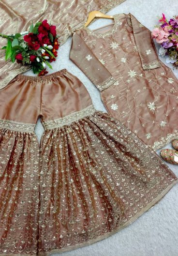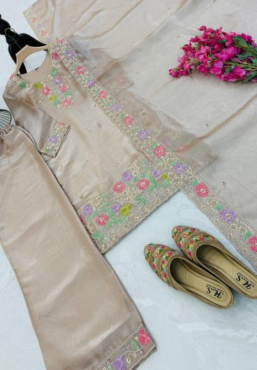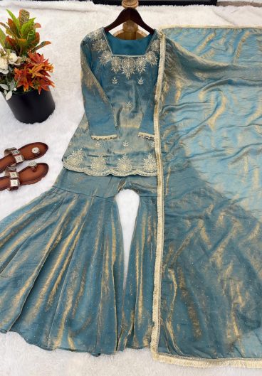 New Designer Party Jimi Cho with Bits Embroidery Sequence Coding Work Top Pallazo & Dupatta Set